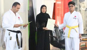 وهذا وقد استعرض الطلاب بعض الحركات الأساسية التي تعلموها اثناء التدريب ( الجيدن بري و الجودن أجوكيه و الستوكيه و الأويزوكي و الشتوكيه و الماي جري)، وفي الختام قامت راعية المناسبة بتسليم الشهادات على الطلاب الحاصلين على الحزام الاصفر.